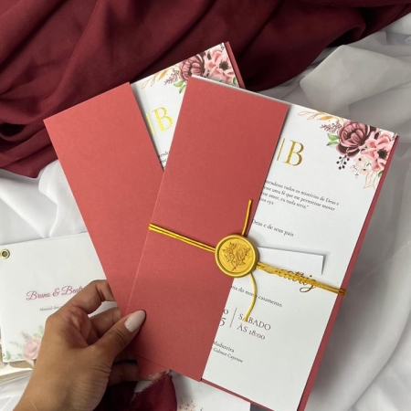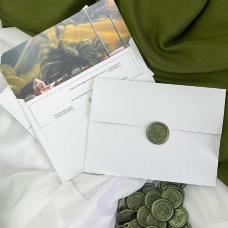 • Convite com hotstamping com envelope tradicional forrado e lacre de cera