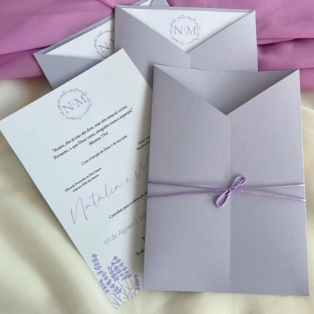 • Convite com hotstamping e borda almofadada, envelope tradicional com hotstamping e fio de seda