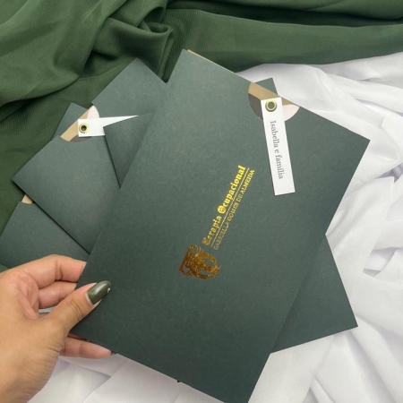 • Convite com hotstamping e borda almofadada, envelope tradicional com hotstamping